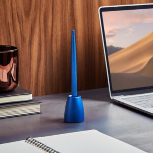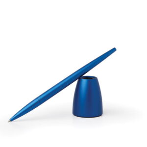 Conjunto de caneta tipo rollerball e base para arrumar na vertical, em alumínio. A carga é universal, tem dimensões Ø4 x 18 cm, o conjunto pesa 170g.