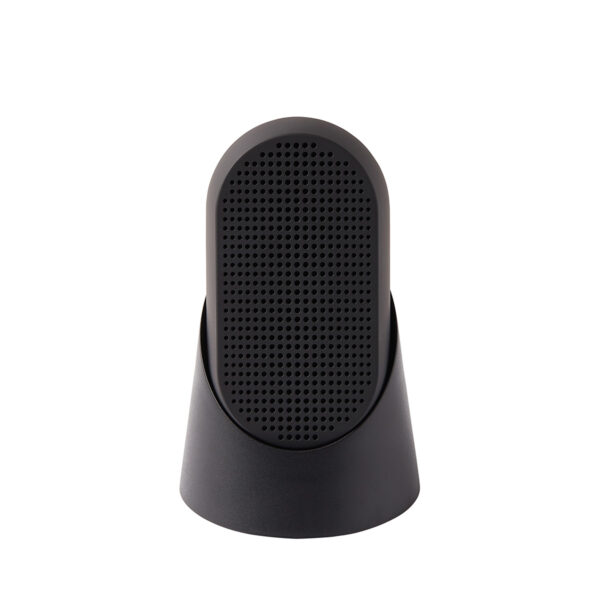 Coluna bluetooth 5W em ABS com mosquetão integrado em liga de zinco. Tem resistência à água IPX4, bateria recarregável por USB-C com autonomia para 5 hrs de funcionamento, suporta TWS. Inclui uma base para pousar. Dimensões 5.3 x 2.9 x 9.7 cm, pesa 121 gr.